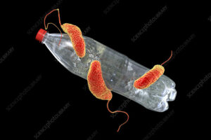 Illustration of Ideonella sakaiensis bacteria degrading a plastic bottle. Credit: Kateryna Kon / Science Photo Library